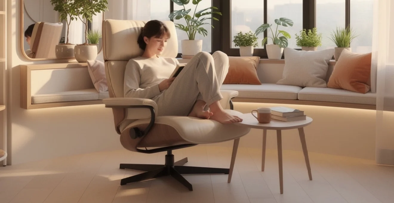 Le choix du fauteuil de lecture constitue le cœur de l’aménagement. Opter pour un fauteuil Stressless ou Fritz Hansen en cuir clair – beige sable, gris perle ou blanc cassé – permet non seulement d’assurer un confort ergonomique, mais aussi de réfléchir la lumière naturelle. Les cuirs lisses ou semi-anilines renvoient délicatement les rayons, ce qui contribue à éclaircir visuellement l’espace sans créer de reflets agressifs. Un piétement pivotant offre la possibilité d’ajuster l’orientation du fauteuil par rapport à la fenêtre au fil de la journée, afin de trouver le meilleur compromis entre lumière et confort visuel. Vous obtenez ainsi un coin lecture baigné de lumière naturelle où votre corps est parfaitement soutenu et vos yeux préservés.