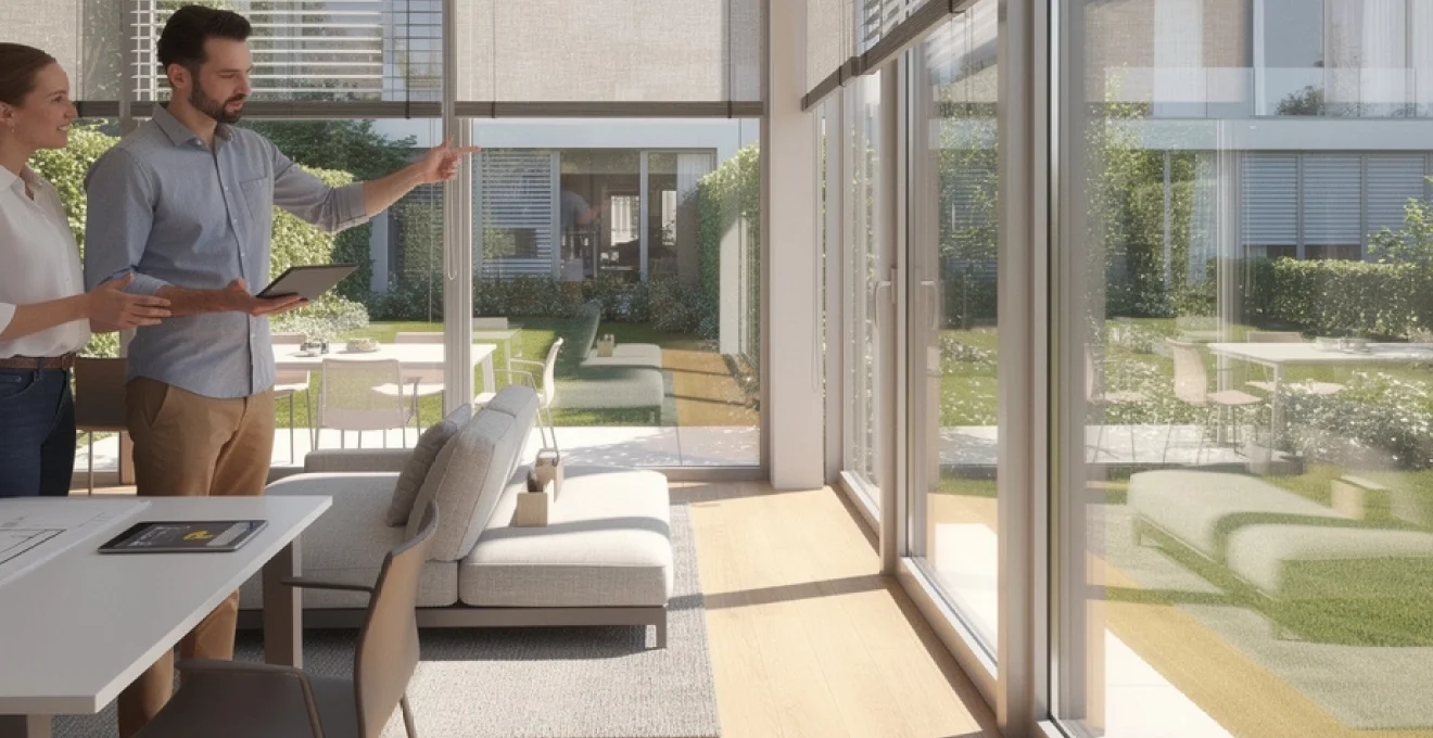 Un mur de lumière performant ne se contente pas de laisser entrer le soleil : il le dose. Sans une gestion fine des apports solaires, vous risquez d’obtenir des espaces surchauffés en été ou soumis à un éblouissement inconfortable. C’est pourquoi les fenêtres en enfilade doivent toujours être pensées avec leurs dispositifs de protection et de régulation, qu’ils soient extérieurs, intégrés ou intérieurs.