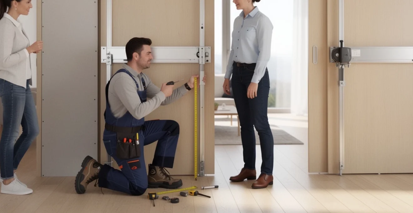L’installation d’un châssis à galandage ne s’improvise pas : elle requiert une méthodologie rigoureuse, proche de celle utilisée pour la mise en œuvre de menuiseries extérieures. La première étape consiste à préparer l’embrasure : traçage au sol et au plafond, vérification de l’aplomb des parois existantes et contrôle de la hauteur sous plafond réelle. Un écart de quelques millimètres peut sembler dérisoire, mais il impactera directement le réglage des chariots et le fonctionnement de la porte à long terme.